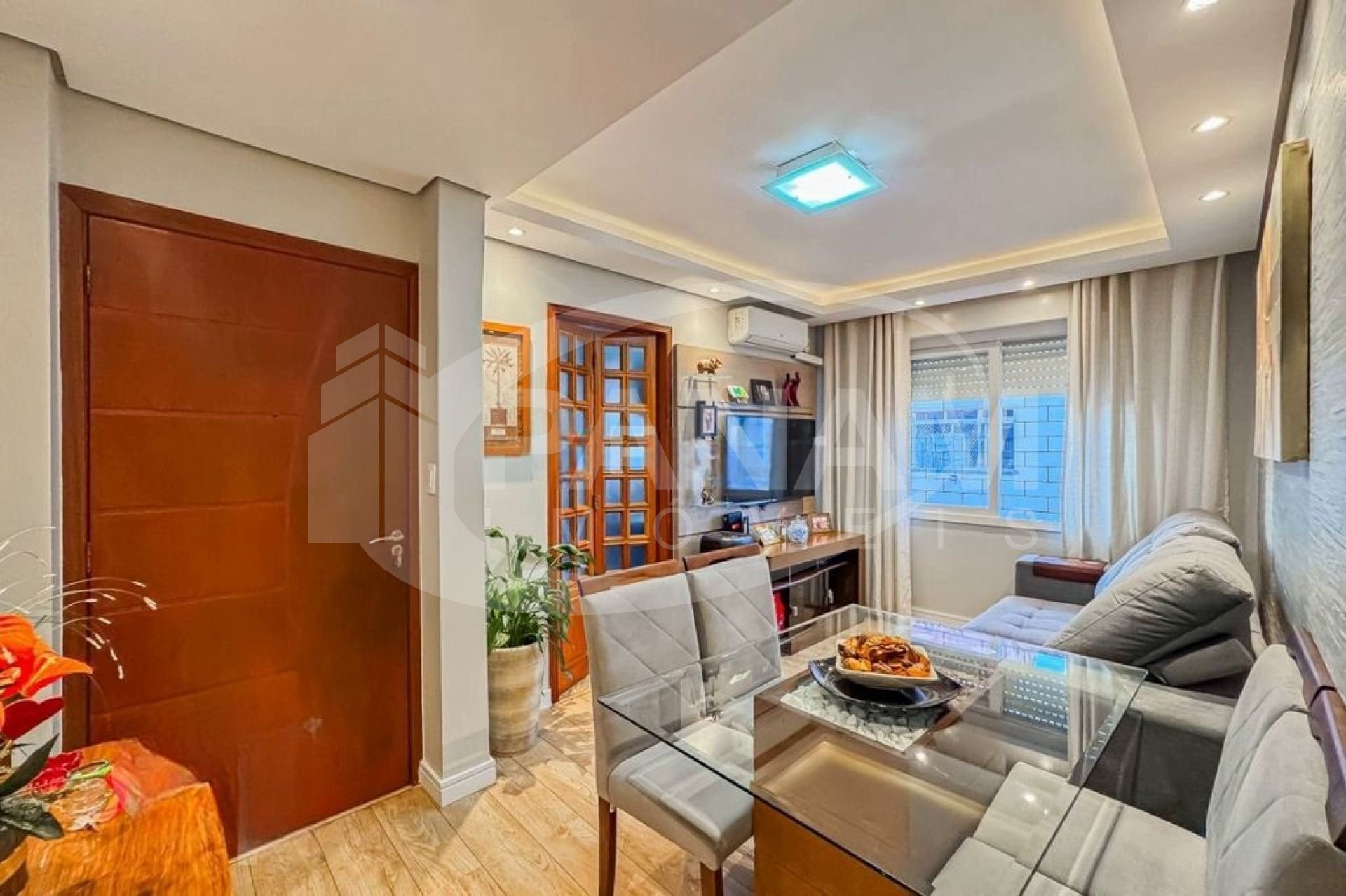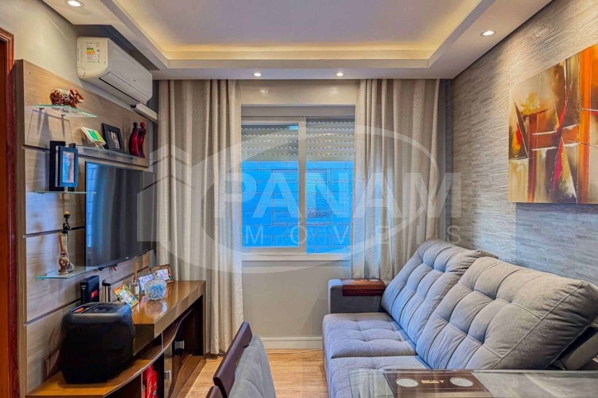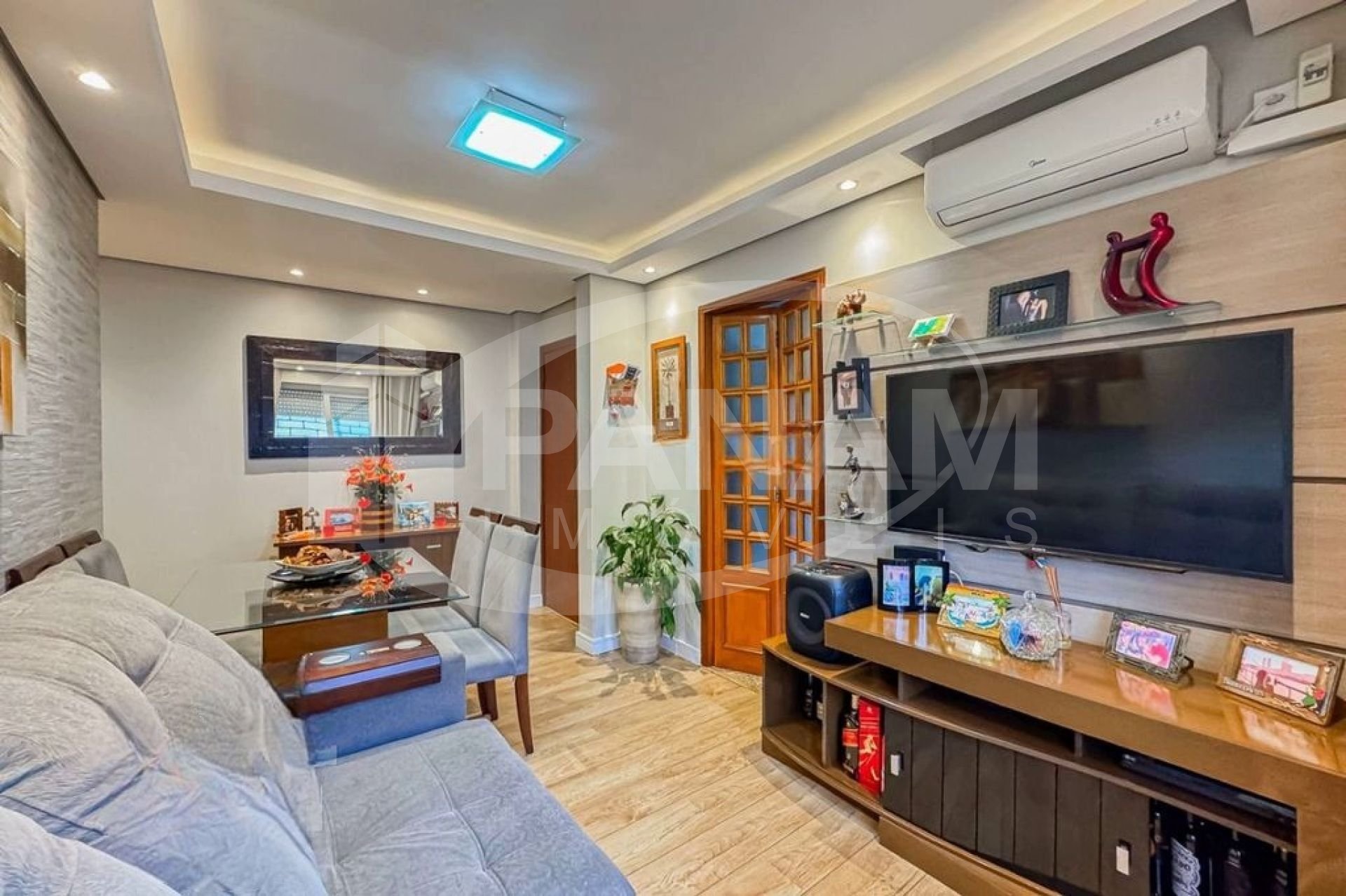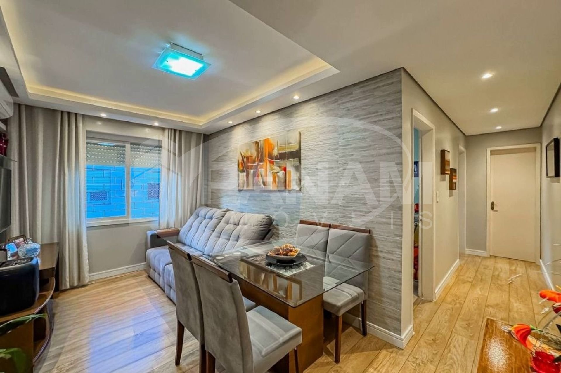 Apartamento com 59m² privativos, bairro Passo da Areia, com dois dormitórios, living dois ambientes, cozinha planejada, área de serviço separada. Condomínio bairro custo com salão de festa. Ficam os móveis fixos, splits.